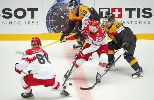 Ein Abnutzungskampf, wie er im Buche steht: Manuel Wiederer und Alexander Ehl rangen mit ihren dänischen Kontrahenten um jeden Quadratzentimeter Eisfläche. © AFP/BO AMSTRUP