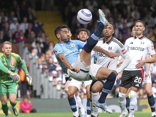 Er kann auch Fallrückzieher: Ilkay Gündogan gelang das wichtige 1:0 für Manchester City. © dpa/Dave Shopland