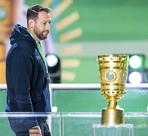 Trauriger Blick von Bielefelds Kniat Richtung Pokal. © Imago