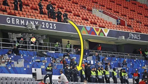 Todessturz von der Tribüne: Der gelbe Pfeil zeigt die Stelle, an der der Fan auf tragische Weise ums Leben kam. © Sampics