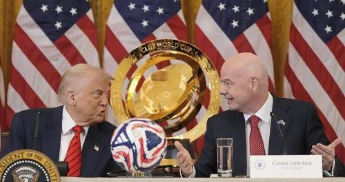 Präsident Donald Trump und FIFA-Präsident Gianni Infantino unterhalten sich während einer Sitzung der FIFA-Task Force im East Room des Weißen Hauses. © Mark Schiefelbein/dpa