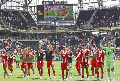 Siegerjubel in Cincinnati: Die Bayern vor der Kurve des eher spärlich gefüllten Stadions. Das Ergebnis allerdings gab Anlass für Optimismus. © IMAGO
