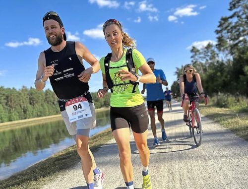 „Das ist eine sehr interessante Art, sich kennenzulernen“: Jonas Deichmann und Josefine Rutkowski beim legendären „Läufchen“, hier am Main-Donau-Kanal entlang. © Privat