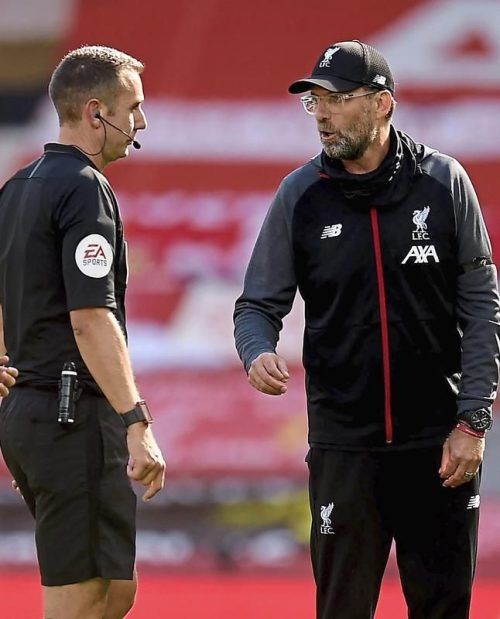 Jürgen Klopp (rechts) und David Coote diskutieren. © Imago
