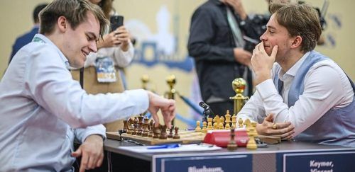 Blübaum (li.) und Keymer vor ihrer Partie in der vorletzten Runde. Sie endete remis. © Fide/Michal Walusza