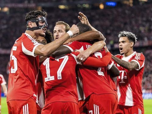 In Dauerschleife: Die Bayern hatten nach ihrer starken Vorstellung allen Grund zum Jubeln. Gleich drei Mal traf das Team um Pavlovic (l.). Gut zu sehen: Doppeltorschütze Kane (Mitte). © imago