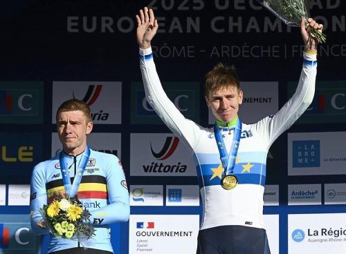 Evenepoel steht nur in Pogacars Schatten: Der Slowene sicherte sich erstmals die Europameisterschaft im Straßenrennen. © IMAGO/Kalut