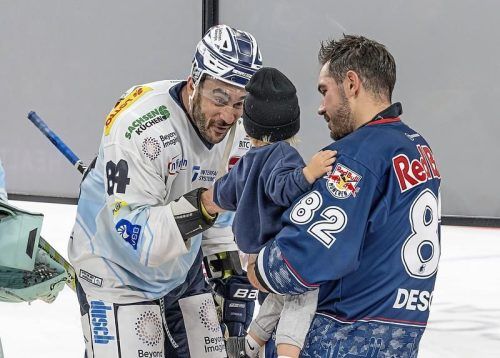 Schöner Abend für Trevor Parkes: Der Ex-Münchner (l.), nun in Dresden, brachte sein altes Team mit einem Tor in Nöten und plauschte anschließend mit Ex-Kollege Chris DeSousa und dessen Nachwuchs. © IMAGO/Eibner