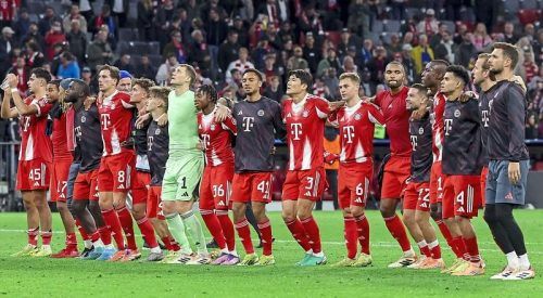 „Europapokalsieger FCB“: Was die Fans nach dem 4:0 gegen Brügge in der Allianz Arena posaunten, gefiel den Spielern um Kapitän Manuel Neuer sichtlich. © Steinbrenner/IMAGO