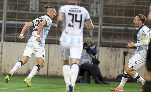 Die Leichtigkeit ist zurück: Jubel von Haugen und Jacobsen, den Torschützen beim 3:1 gegen Duisburg. © Sampics / S. Matzke
