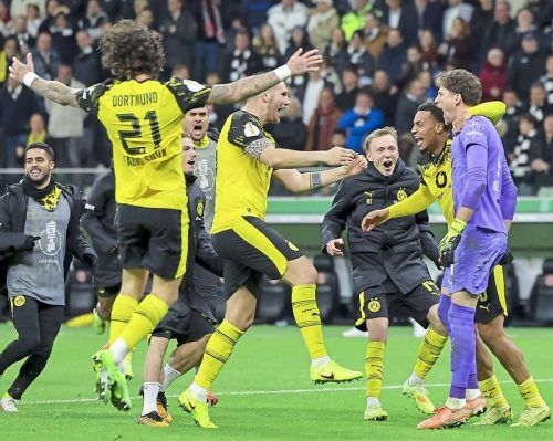Unbändige Freude: Die Dortmunder sprinten nach dem entscheidenden Elfmeter auf Keeper & Matchwinner Gregor Kobel (re.) zu, der BVB darf weiter von Berlin träumen. © Steinbrenner/IMAGO