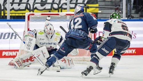 Ständiger Gefahrenherd: Ehliz (Mitte), hier im Duell mit den Berliner Eisbären. © IMAGO