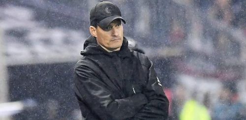 Steht im Regen: St. Paulis Trainer Alexander Blessin. © Bockwoldt/dpa