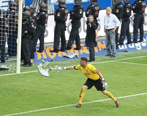 Szenen für die Ewigkeit: Pentke schmeißt eine Sitzschale aus seinem Sechzehner, die Löwenfans hinter seinem Tor sorgen beinahe für einen Spielabbruch. © sampics