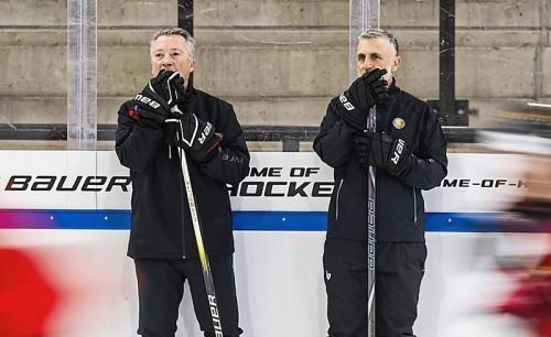 Neugierig aufeinander: Harold Kreis (l.) lud den Ingolstädter Coach Mark French zum Deutschland Cup ein. © DEB/City-Press