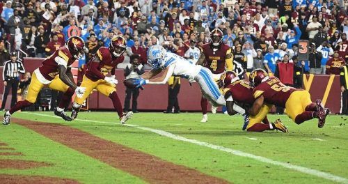 Und ab in die Endzone: Amon-Ra St. Brown, Passempfänger der Detroit Lions, trug maßgeblich zum Sieg gegen die Washington Commanders bei. © Nick Wass/dpa