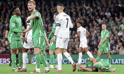 Attacke mit dem Ellenbogen: Irlands Dara O´Shea liegt am Boden, Cristiano Ronaldo schleicht sich davon. © Elliot/Imago