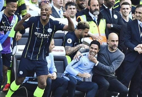 Gemeinsam erfolgreich bei Manchester City: Spieler Vincent Kompany, Co-Trainer Mikel Arteta und Chefcoach Pep Guardiola (v. li.) in der Saison 2019. © Garcia/Imago
