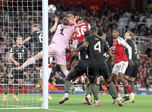 Das 1:0 für Arsenal London: Jurrien Timber behielt im Kopfballgetümmel den Überblick, Torhüter Manuel Neuer sah eher unglücklich aus, wurde aber auch kurz vor dem entscheidenden Moment im Fünfmeterraum behindert. © Rain/EPA