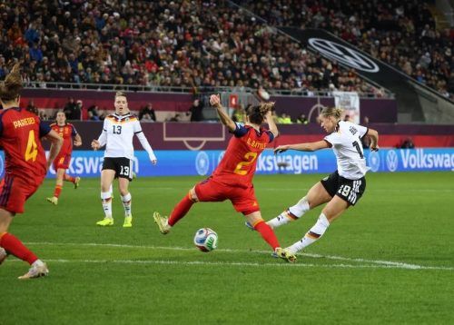Pech im Abschluss: Klara Bühl (re.) traf gegen Weltmeister Spanien nur den Pfosten. © Kleer/Imago