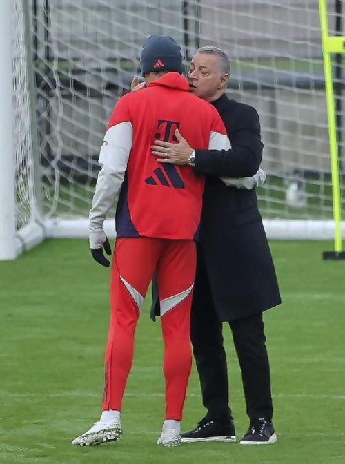 München – Neuer Tag, neues Training. Und: Neuer Gast. Jamal Musiala bekam am Dienstag bei seiner Reha-Einheit Besuch auf dem Rasen. Ex-Bayern-Physio Gianni Bianchi (Foto, re.) schaute in Alltagsklamotten vorbei und umarmte den Edeltechniker herzlich. Der