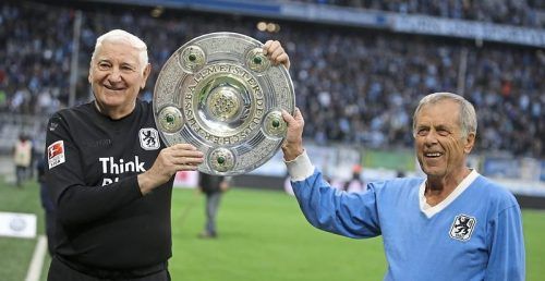 Löwen-Ikonen: Torwartlegende Petar Radenkovic und der frühere Linksaußen Fredi Heiß mit der 1966 gewonnen Meisterschale. © Sampics / Stefan Matzke