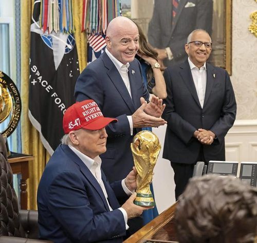 Der Präsident und der WM-Pokal: Donald Trump mit FIFA-Boss Gianni Infantino. © IMAGO/White House