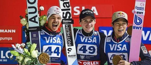 Wisla – Mit breitem Grinsen und fast schon als Stammgast hüpfte Philipp Raimund im ohrenbetäubenden Lärm des Skisprung-Hexenkessels von Wisla auf dem Podest. Neben Weltmeister Domen Prev