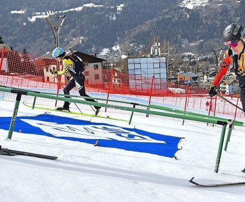 Im Sprint duellieren sich sechs Sportler auf einer Skipiste. Während des Aufstiegs gib es eine Tragepassage in der die Ski geschultert werden. © Abaca/Imago