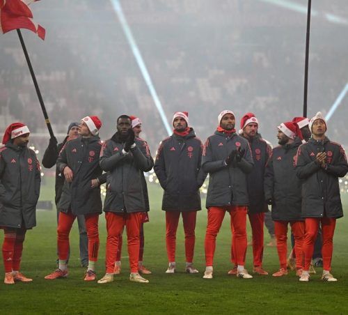 Oh Du fröhliche! Die Bayern-Stars mussten nach dem 2:2 noch Weihnachten feiern – dabei waren sie vom Spiel gegen Mainz relativ enttäuscht. © IMAGO/Feil