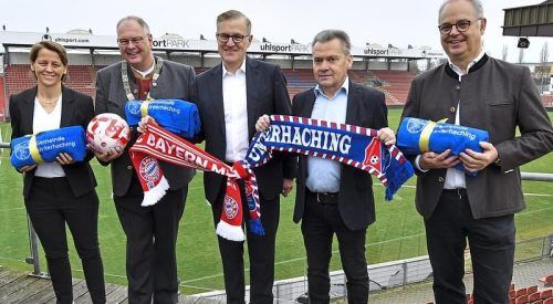 Gruppenbild im Sportpark: Bianca Rech, Wolfgang Panzer, Jan-Christian Dreesen, Manfred Schwabl und Jürgen Muth (v.li.) freuen sich über den Deal. © Niering/dpa