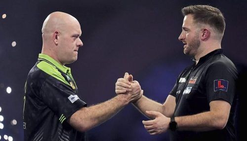 „Die Deutschen sollten öfter trainieren“, sagte Michael van Gerwen (l) nach seinem Sieg über Arno Mer