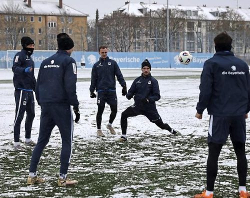 Trainingsauftakt auf Kunstrasen: Der Schneesturm am Freitagmorgen sorgte für einen unbespielbaren Rasenplatz in Giesing. © Sampics (2)