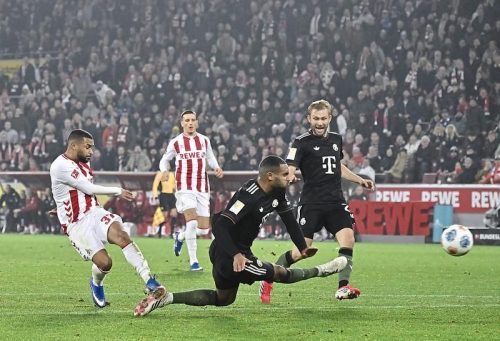 Dann macht es bumm: Das Kölner Gegentor war eine der wenigen schwächeren Momente der Münchner Defensive. © IMAGO/Hölter