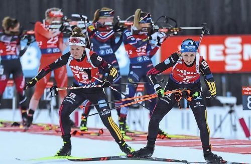 Knackpunkt in der Verfolgung: Zeitgleich verließen Selina Grotian (li.) und Franziska Preuß den Schießstand, beide mussten vor der Schlussrunde in die Strafrunde abbiegen. © Breu/Imago