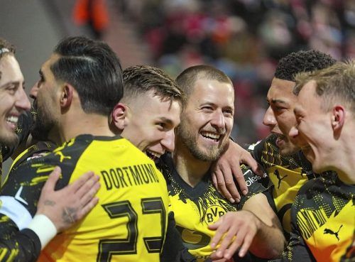 Dortmunder Jubeltraube – Mittendrin: Torschütze Nico Schlotterbeck (2.v.l.) © Stache/dpa