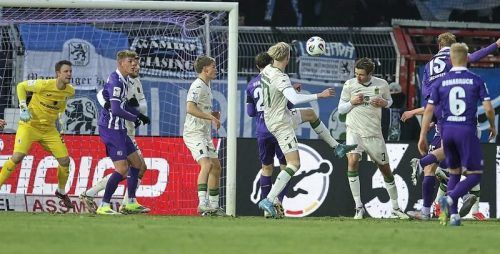 Da ist er drin: Jacobsen (Nr. 15) steht nach einer Ecke blank und köpft ein – 1:0 für Osnabrück. © Sampics
