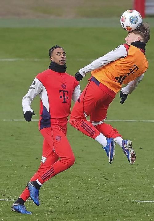Im Training top: Lennart Karl (r.) gegen Olise. © Ruiz