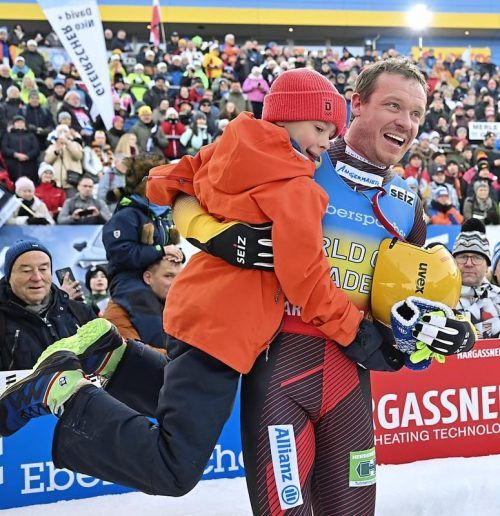 Vaterfreuden: Felix Loch mit seinem ältesten Sohn Lorenz. Der schaut nach einem Wettkampf sofort die Startzeiten an. © Schutt/dpa