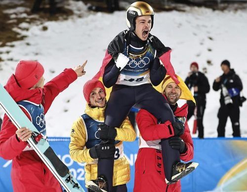 Auf den Schultern von Felix Hoffmann und Pius Paschke (re.) jubelt Skisprung-Held Philipp Raimund über seinen Olympiasieg. Andreas Wellinger kommt dazu. © Karmann/dpa