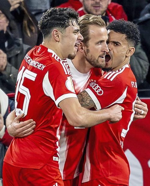 Auf sie mit Gebrüll: Aleksandar Pavlovic und Luis Diaz jubeln mit Harry Kane. © Feiner/Imago