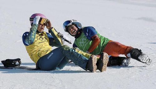 Champion am Boden: Josie Baff (l.) nach dem Zieldurchlauf im Snowboard-Cross. © Plavevski/EPA