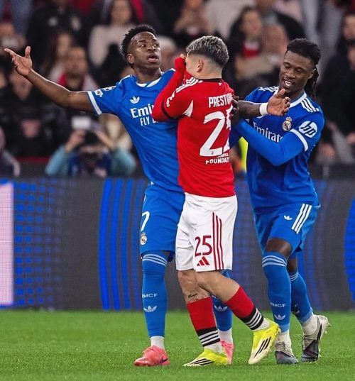 Aufreger des Abends: Gianluca Prestianni (Mitte) im Dialog mit Vinicius Junior. © Lemos/dpa