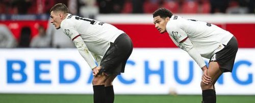 Synchron in ihrer Ratlosigkeit: Die Leverkusener Offensivkräfte Patrick Schick (l.) und Jarell Qansah, dem wenigstens noch der Ausgleich gegen Mainz gelang. © dpa/Marius Becker