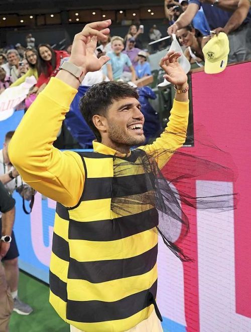 Alcaraz und die Bienen freunden sich langsam an. In Indian Wells musste 2024 aufgrund eines Bienenschwarms das Match zwischen Alcaraz und Alexander Zverev für zwei Stunden unterbrochen werden. Nun wurde Alcaraz an gleicher Stelle wieder von „Bienen“ überrascht. Verkleidete Fans machten sich einen Sp