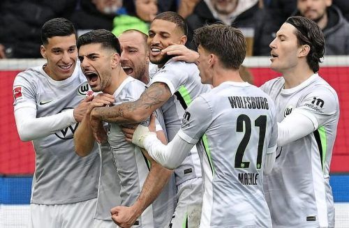 Torschütze Konstantinos Koulierakis (2.v.l.) jubelt mit Mannschaftskollegen über sein Tor zum 0:1. Am Ende holt der VfL Wolfsburg einen wichtigen Zähler im Abstiegskampf. © Anspach/dpa