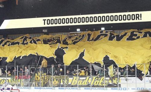Das möchte das Tölzer Eisstadion heute Abend erleben: Toranzeige und Jubel in der Fankurve. © Oliver Rabuser