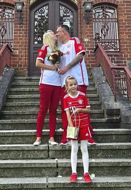 Hochzeit im „feinen“ Bayern-Zwirn: Stephanie Weiß und Frank Schmidt mit Blumenmädchen Maya. © privat