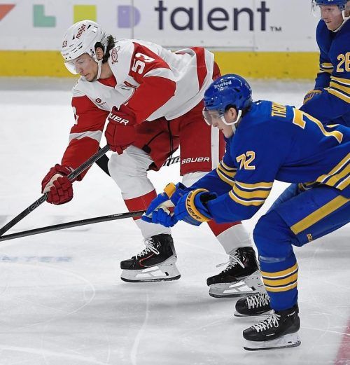 Der kompletteste Verteidiger der NHL: Moritz Seider beherrscht auch das Angriffsspiel – wie er gegen Buffalo gerade wieder zeigte. © dpa(Adrian Kraus