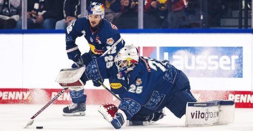 Zum zweiten Mal in Folge stand Simon Wolf im Münchner Kasten – und im Blickpunkt. Brady Ferguson unterstützte den jungen EHC-Torhüter. © Red Bull/City-Press